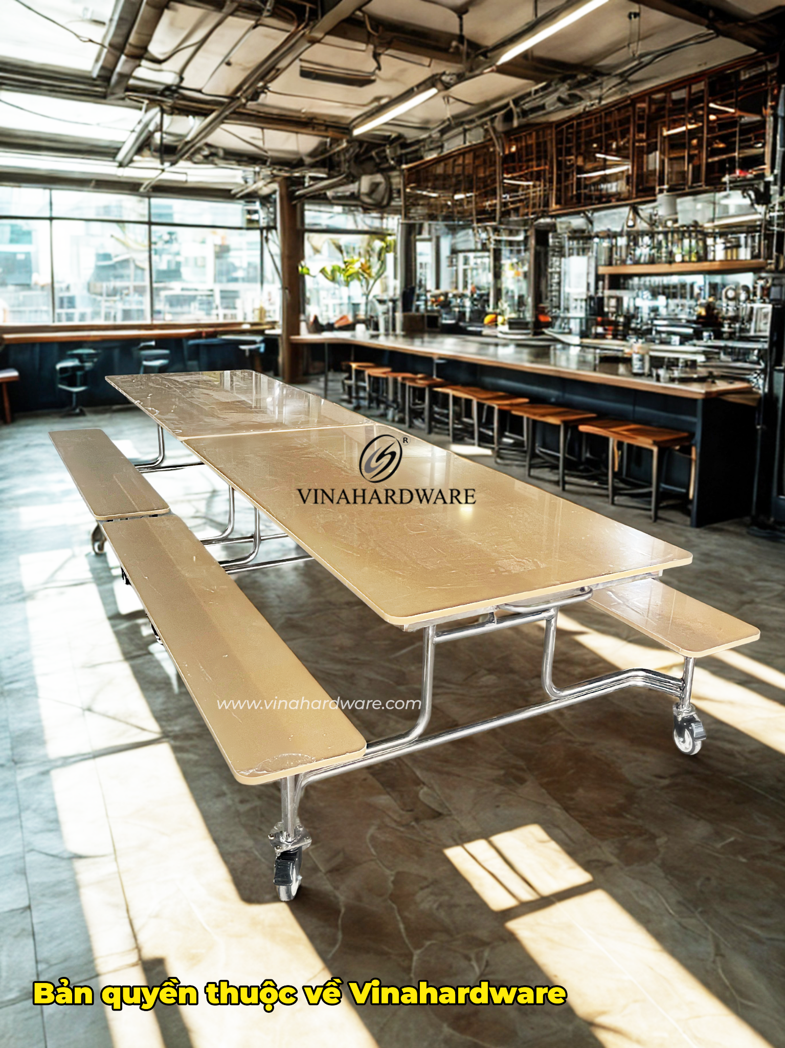 Mặt bàn HPL 12 mm bền màu, chống nước, dễ vệ sinh.