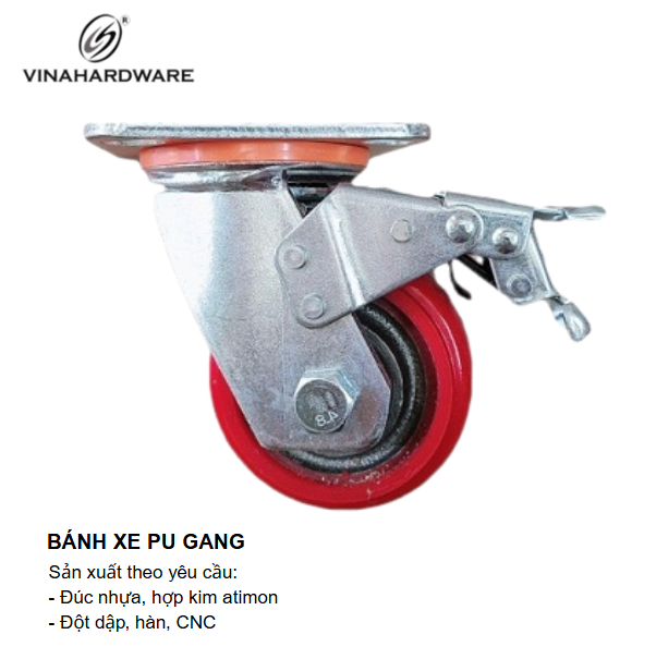 Bánh xe PU gang đỏ được dùng rộng rãi trong công nghiệp, ưu điểm chịu tải nặng, khá chắc chắn, chống ồn, đẩy nhẹ và giảm xóc tối đa. Bánh xe lốp PU cốt gang rất bền, chịu tải tốt, ngoài ra đặc tính PU còn chịu xăng, dầu và hóa chất nhẹ.
