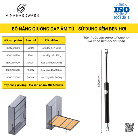*** Lưu ý: Ben hơi thích hợp sức đẩy tương đương 100kg. Trường hợp khung giường thiết kế nặng hơn Quý khách cần điều chỉnh ben hơi phù hợp có thể sức đẩy tương đương 150kg (1500N).