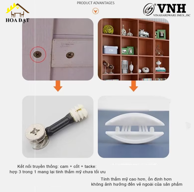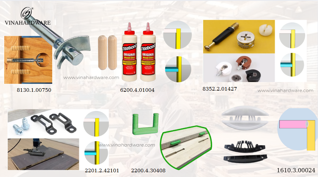 Kết nối truyền thống: cam + cốt + tacke: kết hợp 3 trong 1 mang lại tính thẩm mỹ chưa tối ưu, hiệu suất khoan lỗ thấp và độ ổn định thấp.