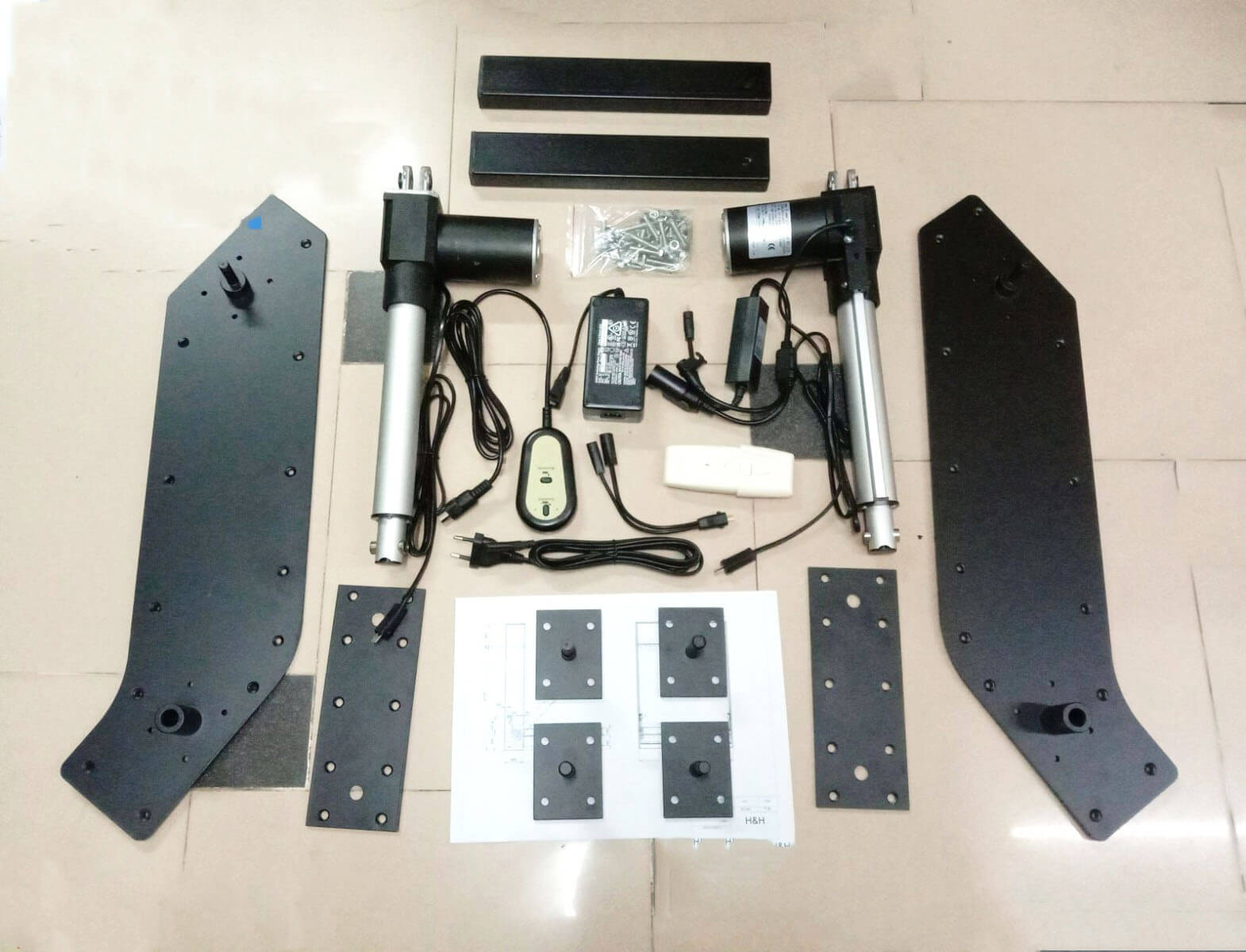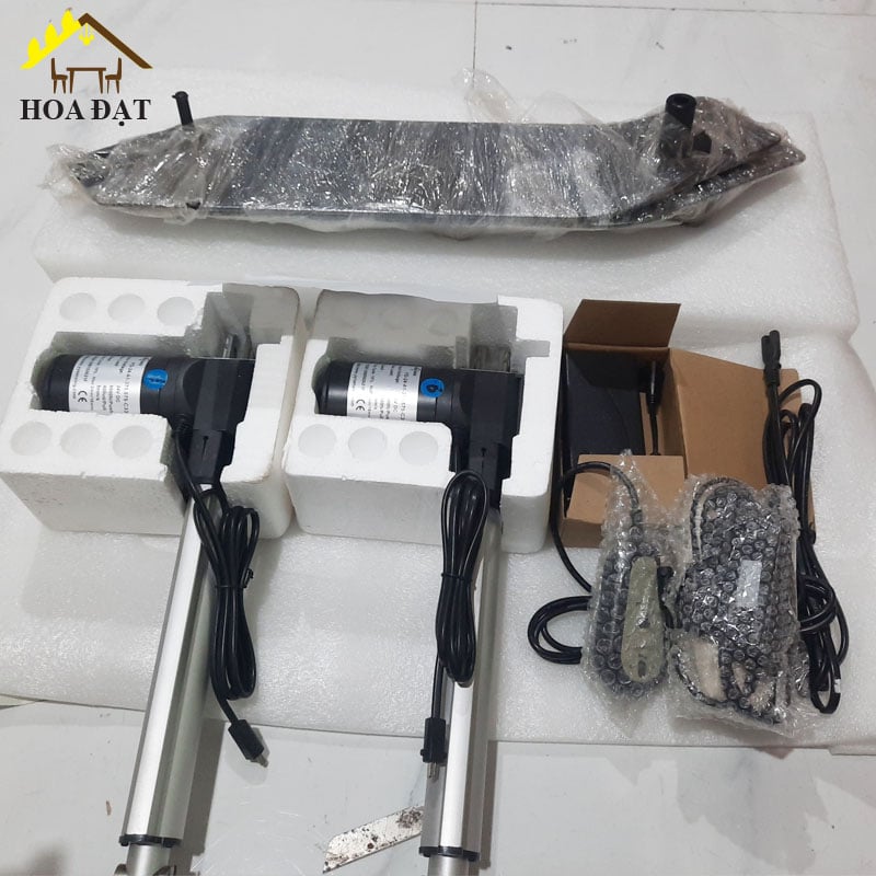 - Cấu tạo: 2 xi lanh điện, 2 bộ trục xoay, bộ nguồn, remote điều khiển từ xa, 2 pat lớn và các pat nhỏ.