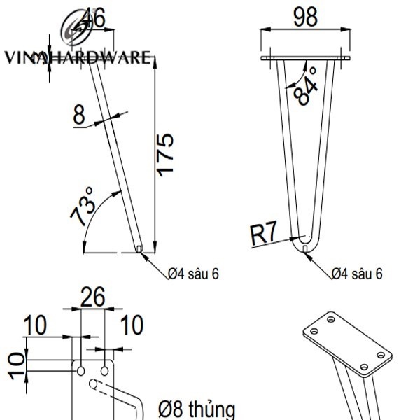 Chân sắt hai nan, phi 8, sơn đen mờ - VNH2208367B