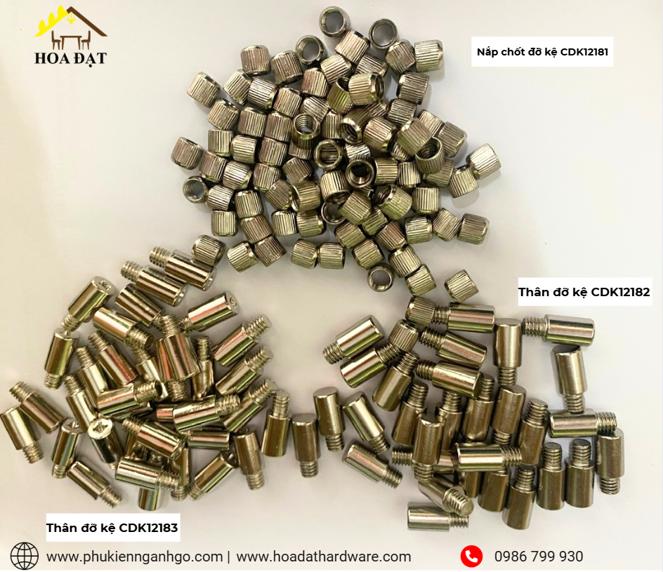 Chốt Đỡ Kệ Vinahardware gồm hai thành phần chính: Thân Chốt Đỡ Kệ Vinahardware - Mã CDK12182 / CDK12183 và Nắp Chốt Đỡ Kệ Vinahardware - Mã CDK12181 . Sản phẩm này được xi mạ nikel sáng bóng, giúp tạo độ bền và thẩm mỹ cao cho các loại kệ ván.