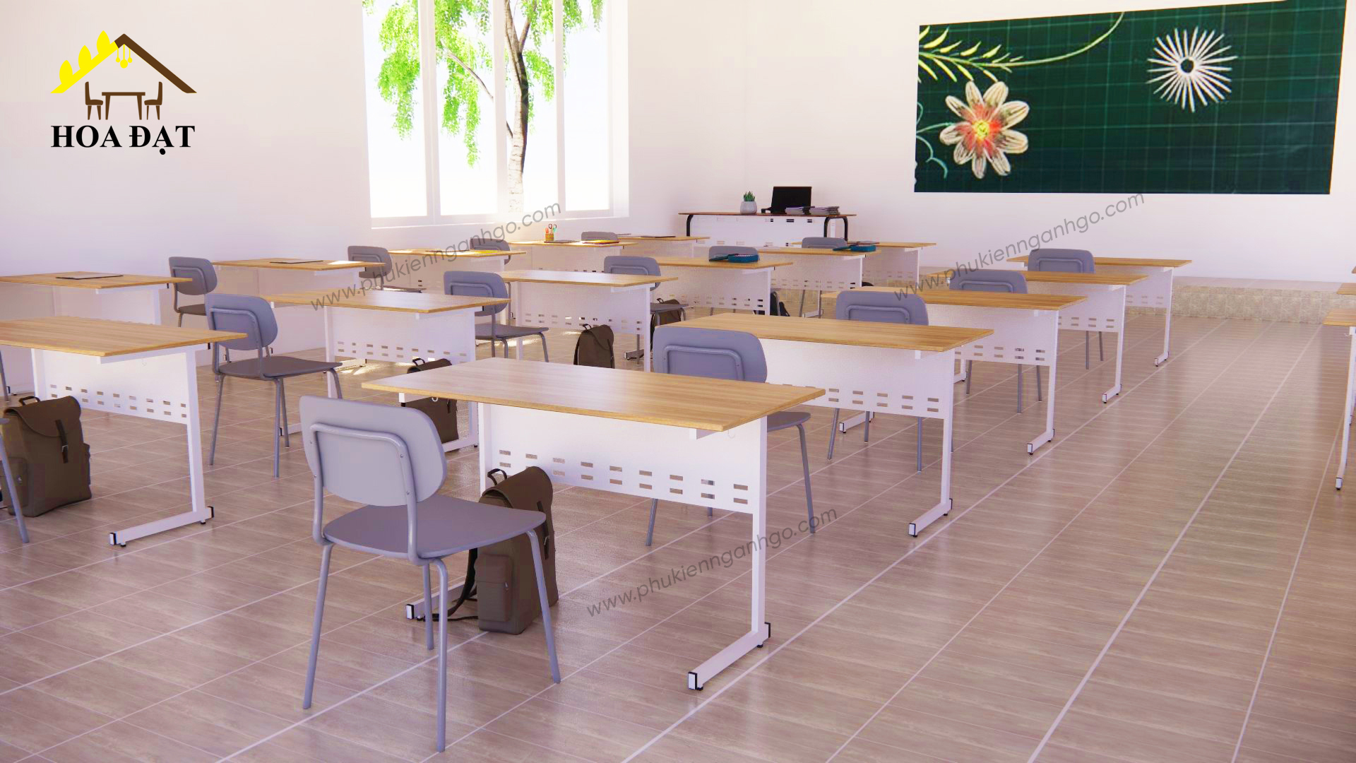 Sản phẩm được thiết kế phù hợp mặt bàn kích thước 1200×500mm, có yếm che phía trước và hộc đựng sách tiện dụng, rất phù hợp với mô hình phòng học hiện đại.