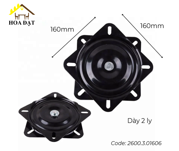 Mâm xoay ghế 2600.3.11606 là giải pháp xoay linh hoạt, bền bỉ cho các sản phẩm ghế xoay, ghế bar, bàn tròn mini hoặc đế xoay trưng bày. Được sản xuất từ thép dày chất lượng cao, xử lý sơn tĩnh điện màu đen chống gỉ sét, sản phẩm cho phép xoay tự do 360 độ mượt mà, không gây tiếng động, chịu lực tốt và bền bỉ theo thời gian.