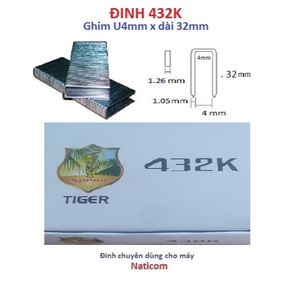 Đinh U 432K (ghim U 432) là loại đinh công nghiệp dạng chữ U, có chiều rộng 4mmchiều dài chân đinh 32mm, chuyên dùng cho súng bắn đinh hơi.