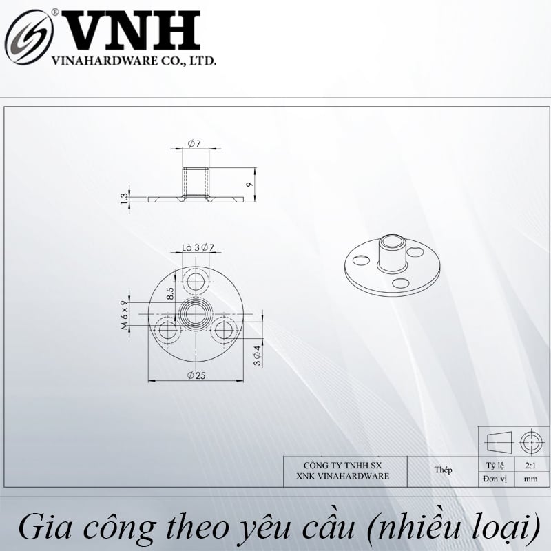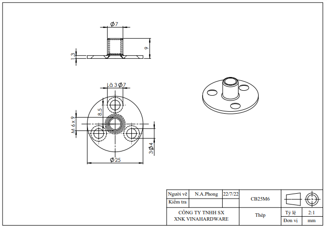 Bản vẽ chi tiết sản phẩm loại Phi M6, đường kính 25mm ( hệ inch)