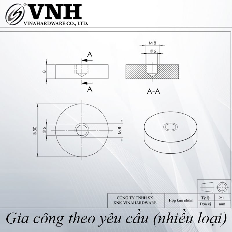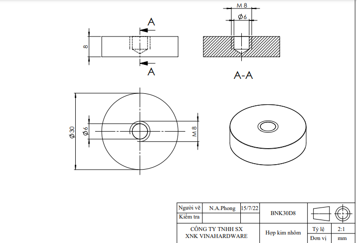 Bản vẽ chi tiết sản phẩm Phi 30, dày 8mm, lỗ ren M8